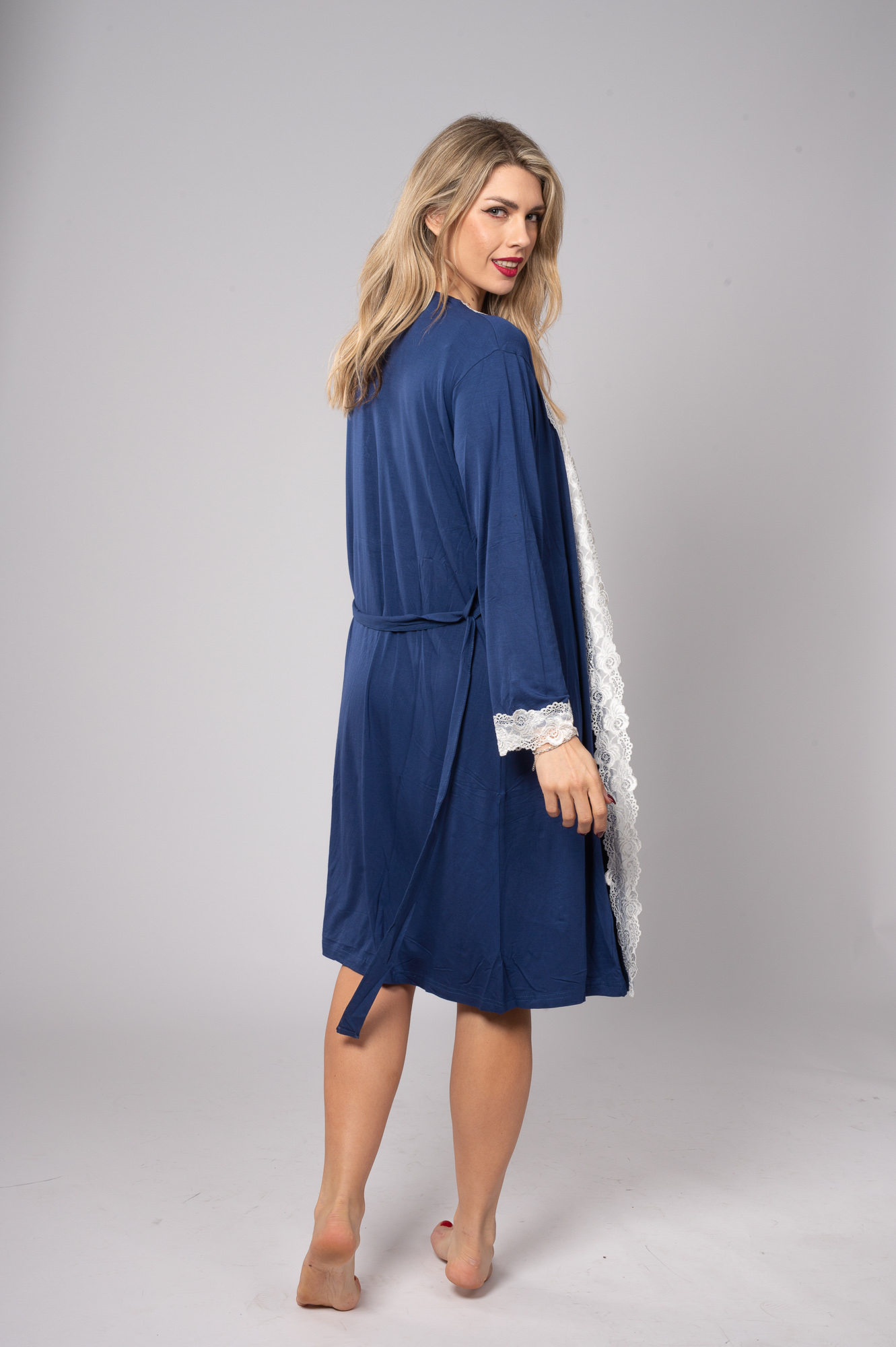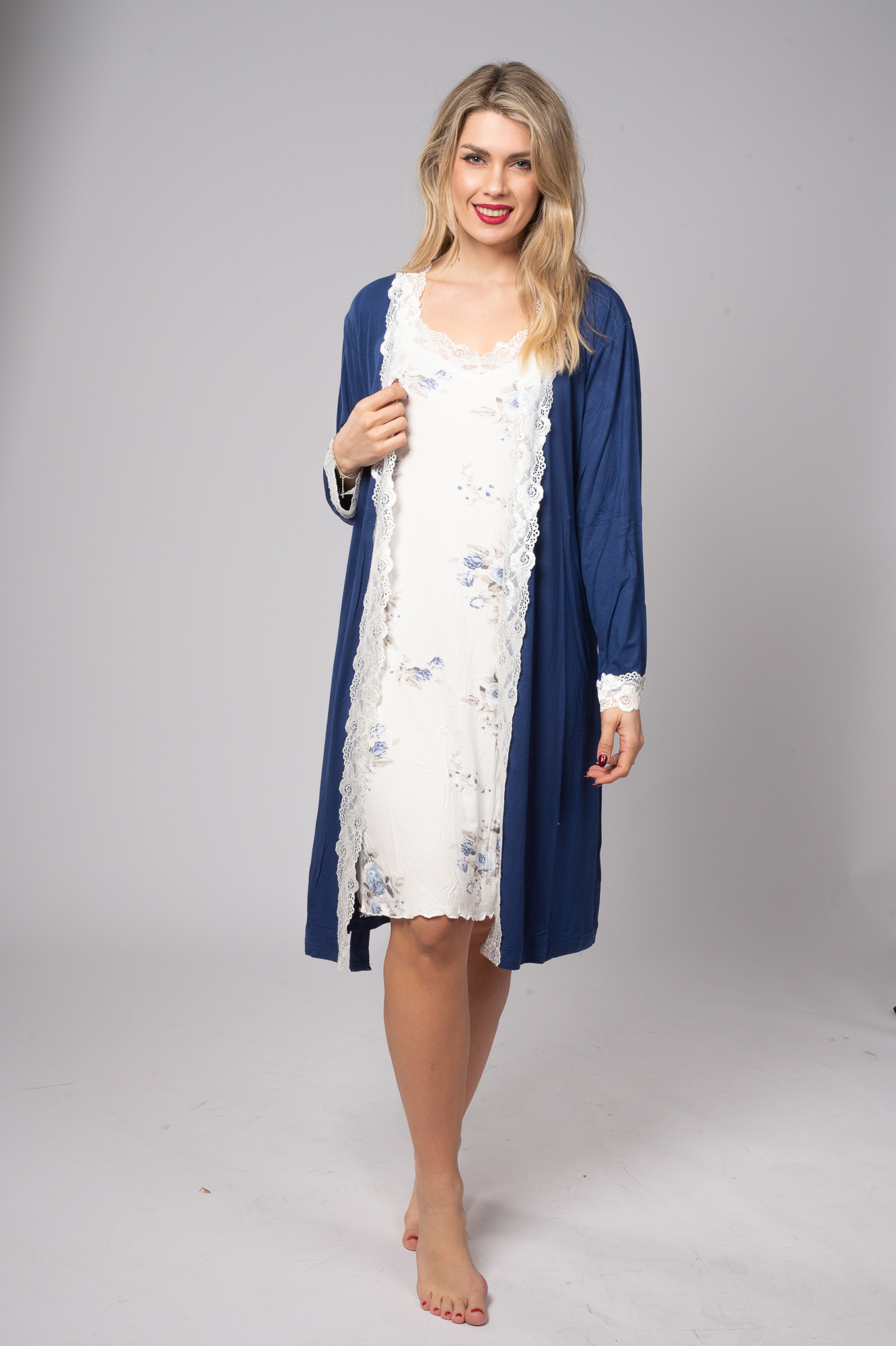 Γυναικείο σετ σατέν νυχτικό με λουλούδια με ρόμπα μπλε
