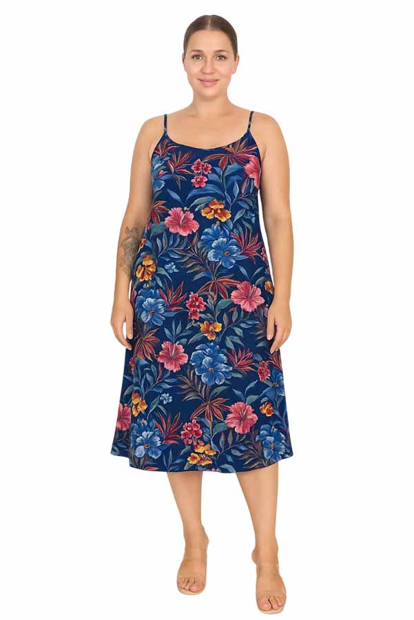 Φέρετε το καλοκαίρι πιο κοντά σας με αυτό το υπέροχο γυναικείο φόρεμα ραντάκι με έντονο λουλουδάτο μοτίβο σε μπλε φόντο. Με τροπικά άνθη σε αποχρώσεις του κόκκινου, μπλε, κίτρινου και ροζ, προσθέτει μια δόση φρεσκάδας και ανεμελιάς σε κάθε σας εμφάνιση.